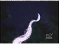 Pulsing white electricity shoots repeatedly down from the crescent moon in the night sky. |