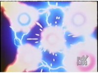 Five balls of Ranger-colored energy (green for black), each covered in yellow flames and connected by blue electricity come forth, then spin around into one combined swirling ball of red flaming power. |