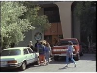 Exterior of Youth Center, large crowd of people head toward the entryway, at very end, blonde in pink sweater approaches white car. |