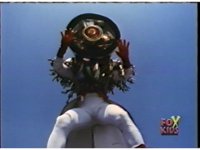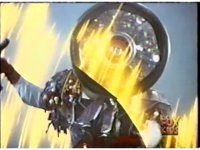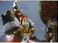 Standing on balcony, Lord Zedd raises his left hand, creates a growth grenade, says something, then pitches it over the railing, causing flashing of light, which makes Goldar cover his eyes. |