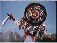 Thunder Megazord whips saber around, then stabs it forth into the camera. |
