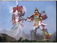 Scatterbrain gets his sword knocked up by Thunder Megazord's saber, which then smacks him in the chest, and on the back as the Megazord and the monster pass each other. They then remain facing in opposite directions, frozen for a moment, before suddenly turning to face their opponent, weapons ready. |