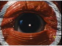 Extreme close-up of Scatterbrain's sole, bloodshot eye, as it shakes about in agony. |