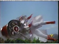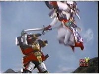 Scatterbrain is hurtled into the air by the Thunder Megazord, which pulls its saber out of his chest in doing so. |