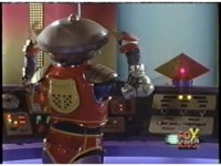 Tube Monster spreads arms and gestures forth, as shot zooms out, Thunder Megazord facing him in foreground, each passing over to their respective left. |