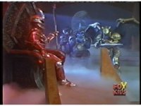 Side angle on Zedd, sitting on throne, talking to his minions, as Baboo & Squatt cower in background, and Goldar bows with is sword crossed. |