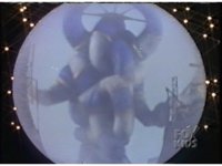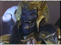 Standing on balcony, with Goldar cheering him on, Lord Zedd switches staff to right hand, looks at left, creates a growth grenade, then pitches it over the railing, causing flashing of light. |