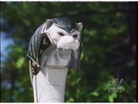 Sabertooth Tiger Dinozord races to our left along mountainous terrain, suddenly gets struck by lightning, and morphs into Griffin Thunderzord. |