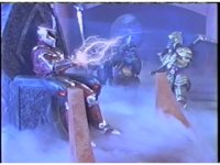 As Goldar watches in background, Lord Zedd holds his staff horizontally, standing at balcony railing, he slowly turns it slightly to his left, before jutting it forth and firing off flashes of energy off frame as Goldar raises his arms. |