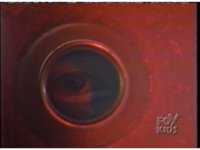 Close-up of Baboo's eye peering through peep hole, red light covering it, causing him to look out. |
