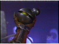 Standing on balcony, facing our slight right, Zedd twirls staff around completely, charges it up, talks, then thrusts it forth, firing off energy, as Squatt & Baboo hang around with the Z-Putties in the far background. |