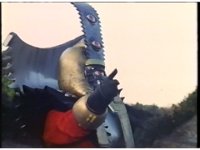 As his twin sawblades fall to the ground, pan up to show Jaws of Destruction clutching his smoking chest. |
