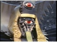 Extreme close-up of Thunder Megazord's face as its eyes glow yellow, while lightning flashes off-frame. |