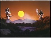 Close on Blue Ranger, crossing arms in front of face before posing down in a crouch, then another to our left. |