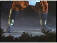 Close on Jaws of Destruction's legs, spaced apart, as dusty wind blows across his boots. |