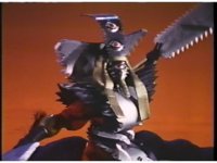Slightly downward angle close-up of Lord Zedd on balcony, ceasing his Zedd vision, talking as camera lowers to level ground, he reaches right hand up in front of mouth region and snaps it into a fist, as Goldar lurks in background the whole time. |