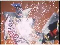 As Thunder Megazord turns its back to Jaws of Destruction, the monster spark bursts rapidly, then explodes into a huge fireball, which, after a flash of white, turns into a huge puff of smoke with added sparks, as the Megazord prepares saber for resheathing. |