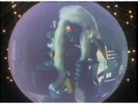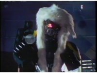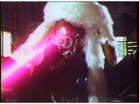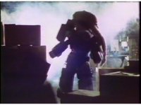 Semi-side angle close on Weldo as he ceases marching, then motions arms about, while firing pinkish beams to our lower left. |