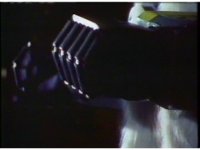 Close on Weldo as bluish beam strikes him, causing him to spark burst and spread arms in agony. |