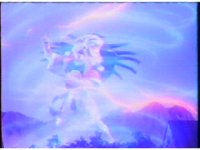 As Saber surges with yellow electricity, blue lightning crackling about the background, Thunder Megazord pulls it back from its right, and holds it up against left shoulder. This causes the blue lightning to fade into a drawn backdrop of waterfalls, eyes flashing, as Thunder Megazord steps forth and slashes Saber diagonally downward. |