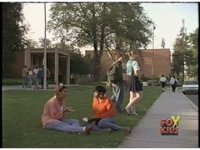 Courtyard of Angel Grove High School, two girls sit on the grass talking, while a guy and girl walk up behind them, onto the sidewalk. |