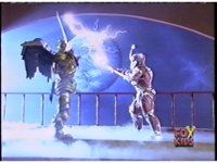 Goldar stands to our left, pumping arms in the air, as Zedd lifts up charged staff and thrusts it over railing, firing a constant stream of energy at the Earth cut-out, causing flashes of light to our left. |