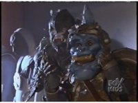 As shot zooms out, Zedd turns away from Earth, and steps down from balcony, walking to Goldar, who talks and eventually bows before him. As he un-bows, Zedd turns back around and gestures out arm. |