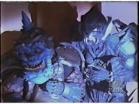 Cowering in a corner, the shadow of the fan vent casting over them with each revolution, Squatt & Baboo clap hands and wave their arms nervously. |