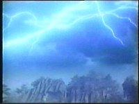 Mastodon Dinozord charges to our left along mountainous terrain, suddenly gets struck by lightning, and morphs into Lion Thunderzord. |