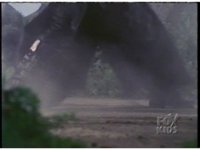Close on Thunder Megazord's feet as they stagger back amid a bunch of smoke, pan up as it stabilizes and poses battle ready amid smoke. |