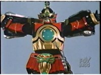 Close on Thunder Megazord turning to its right and around until its back is to us, while motioning Saber widely. |