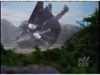 Pterodactyl Dinozord flies to our left along mountainous terrain, suddenly gets struck by lightning, and morphs into Firebird Thunderzord. |
