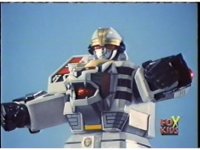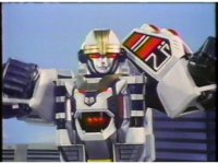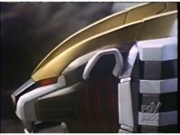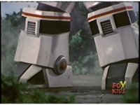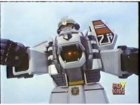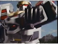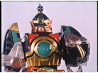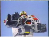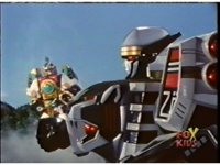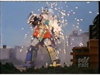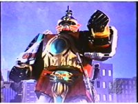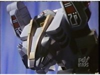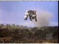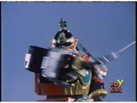 Close, side angle on Thunder Megazord, as it leans back in reaction to something. |