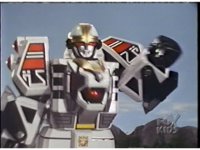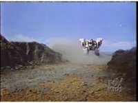 White Tigerzord charges down a dusty ravine, leaping forth with each step. |