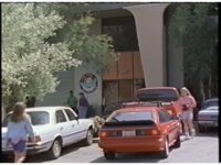 Exterior of Youth Center, red car pulls up and parks behind red truck, as woman in pink exits car on right, and girl in blue approaches. |