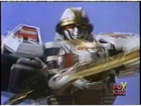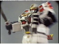 Zoom out from White Tigerzord's hind quarters as it folds back into humanoid legs, zoom in sharply on its face, causing a rapid white flash. Zoom out as the upper section of the White Tigerzord folds downward into an upper torso, then zoom in as its humanoid head rises from top of raised back. |