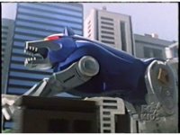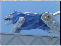 Side angle on Blue Wolf Ninjazord, howling as it races along through the city to our left. |