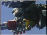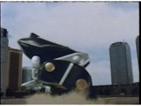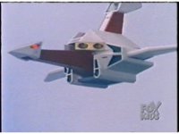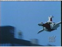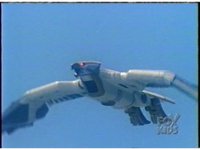 Close, side angle, as Ninja MegaFalconzord soars through the sky to our left. |