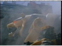 Side angle, follow along as Yellow Bear Ninjazord roars while walking through a dusty construction site. |