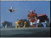 Above the city, the Yellow Bear chest piece floats in close to the screen, as Red Ape & Blue Wolf transform off-frame, connect as the arms, and Pink Crane as the head to the completed upper torso. |