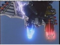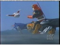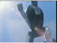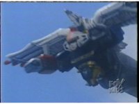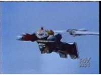 Ninja Megazord flies through the sky slowly. Zoom in on it as the White Falcon soars in and hovers above its back, causing a rapid flashing of light. |