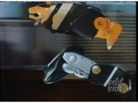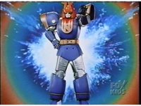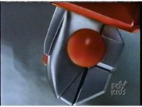 Against a backdrop of an implosion upon a sun, Ninjor throws his fists downward, zoom in on his face, as he turns to CGI, and his head folds backwards, causing another head to flip up from his chest emblem, and his sleeves pop up into shoulders. Pan down to his legs, as the thighs slide down to become boots. Now no longer CGI, Ninjor in Battle Mode poses each of his fists raised separately, as the implosion behind him reverses and explodes brightly. |