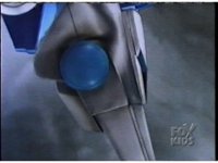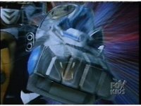 Against a multicolored backdrop, Ninja Megazord, in slow motion, punches the Blue Wolf fist into the screen, rapidly intercut with an image of the vicious Blue Wolf Ninja Spirit. |