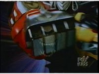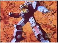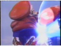 Against a multicolored backdrop, Ninja Megazord, in slow motion, punches the Red Ape fist into the screen, rapidly intercut with an image of the rabid Red Ape Ninja Spirit. |