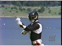 In front of the lake, Black Ranger does his Zord summoning gestures. |