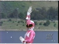 In front of the lake, Pink Ranger does her Zord summoning gestures. |