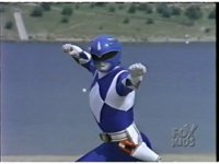 In front of the lake, Blue Ranger does his Zord summoning gestures. |