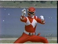 In front of the lake, Red Ranger does his Zord summoning gestures. |