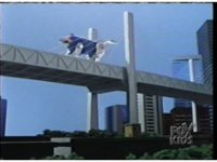 Zoom out sharply, as Blue Wolf Ninjazord hops off rooftop, and converts to blue energy, bounces between pillars on a bridge, then rematerializes on the bridge, racing to our left along it. |