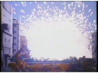 Pan up as Black Frog leaps directly over us, above the buildings, beneath the sun. |